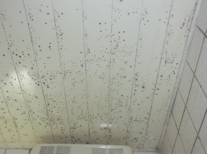 浴室壁面と天井に発生した黒カビ汚れの一例です。 漂白洗浄後にしっかりと中和も行います。